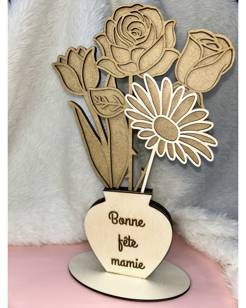 Bouquet de fleurs en bois gravé – Bonne fête Mamie
